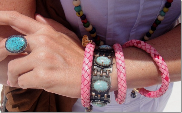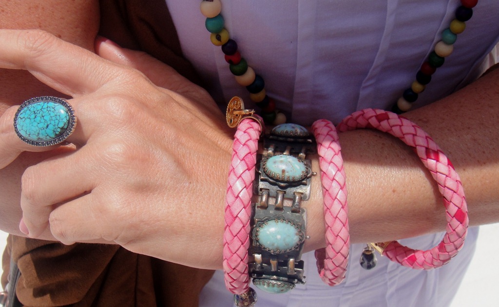 …. com bracelete de prata e turquesa vintage e pulseiras de couro e ouro PD.