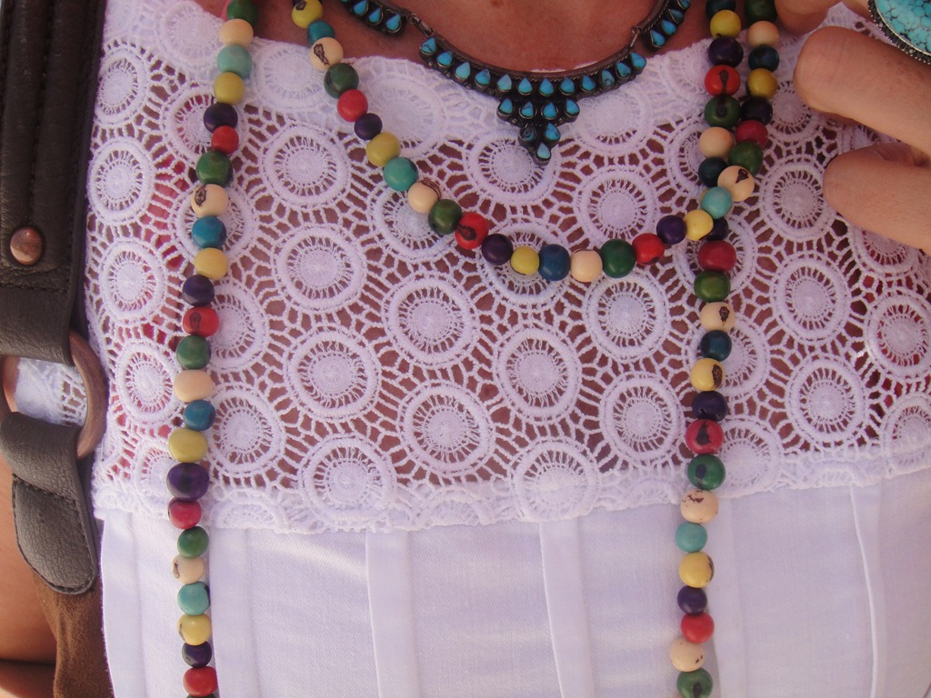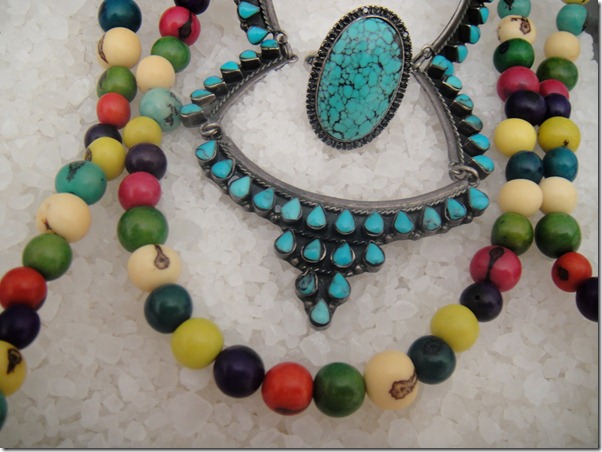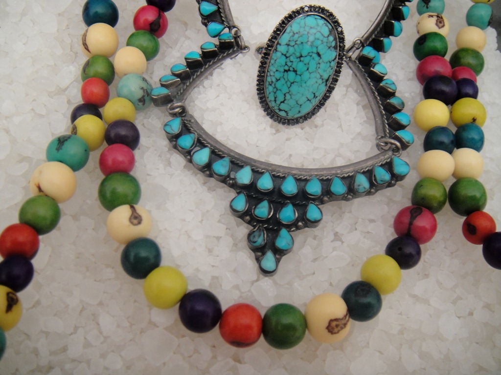 mistura étnica: colar de turquesas do Mexico,de sementes da Bahia e anel de turquesa PD