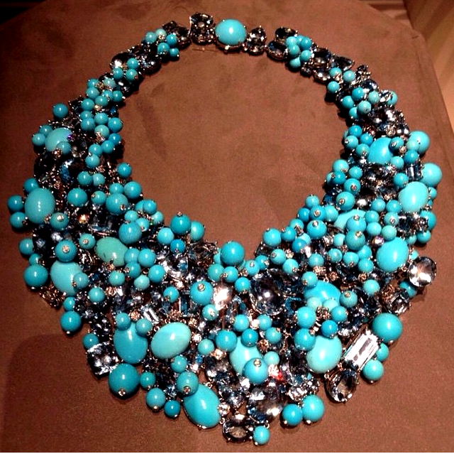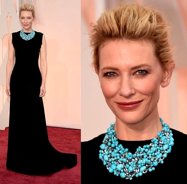 Ontem no Oscar 2015, esse colar de Cate Blanchet iluminou seu pretinho Maison Margiela by John Galliano. O colar foi Tiffany – uma gola de luxo em azul –
