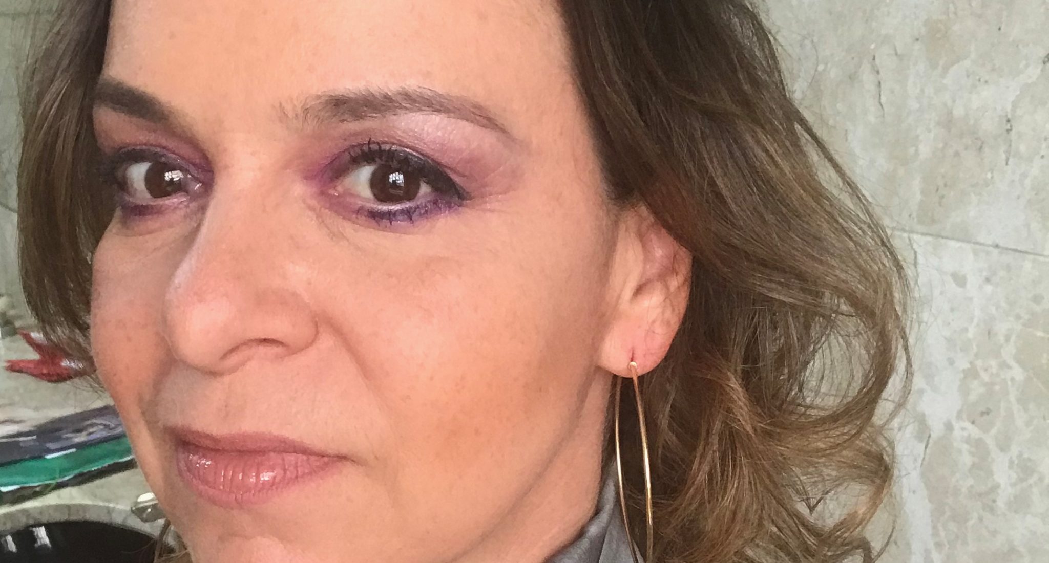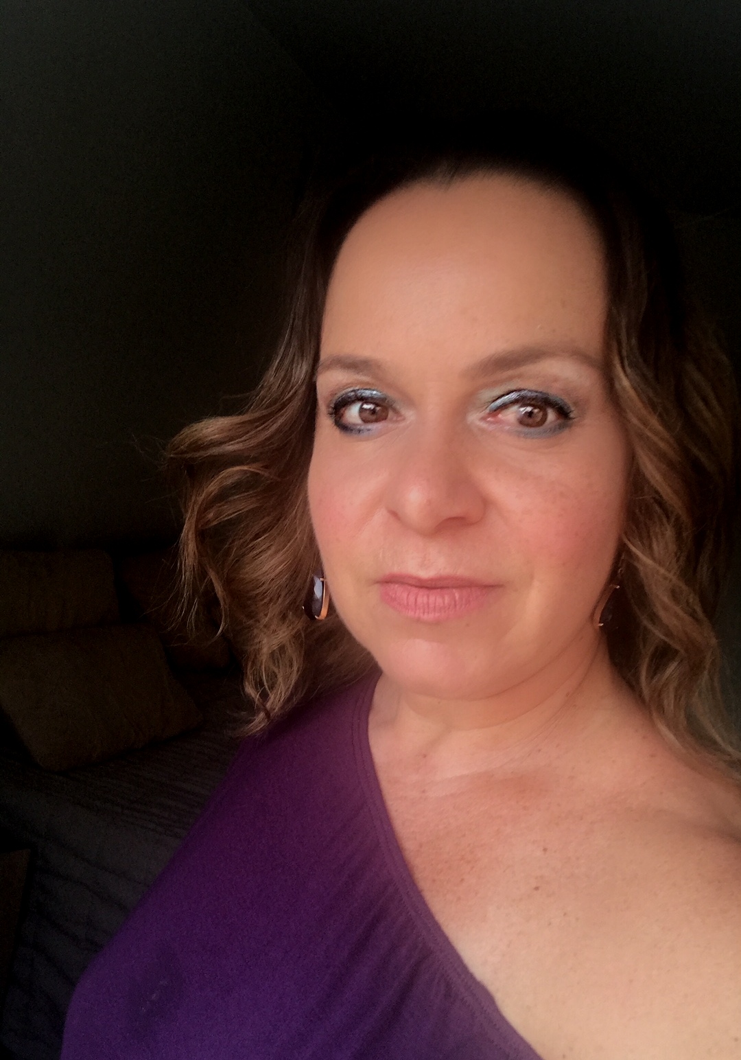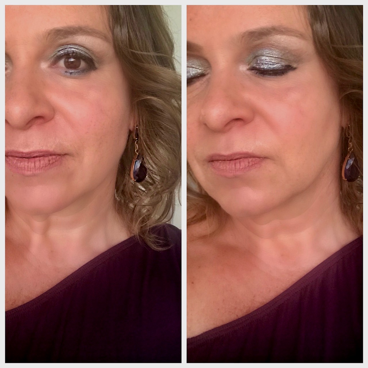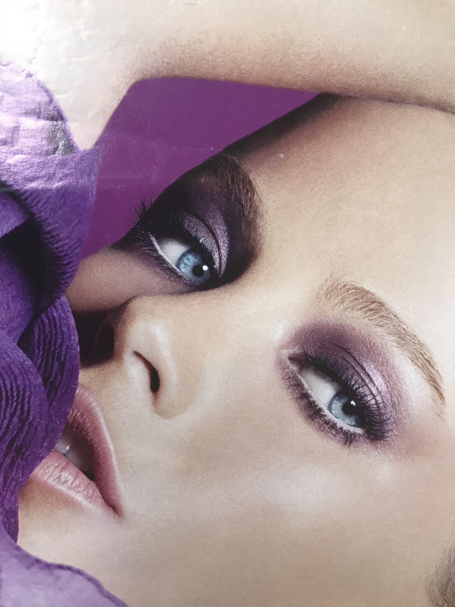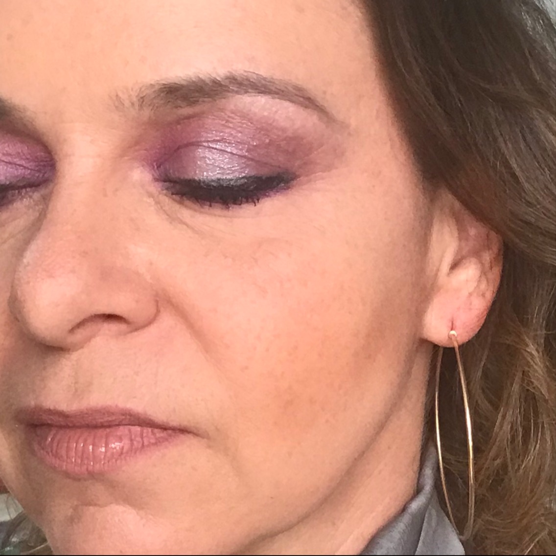 Fiz esse conceito da foto: olho bem esfumado em vários tons de roxo com fundo bordô, pele bem feita, boca nude.
