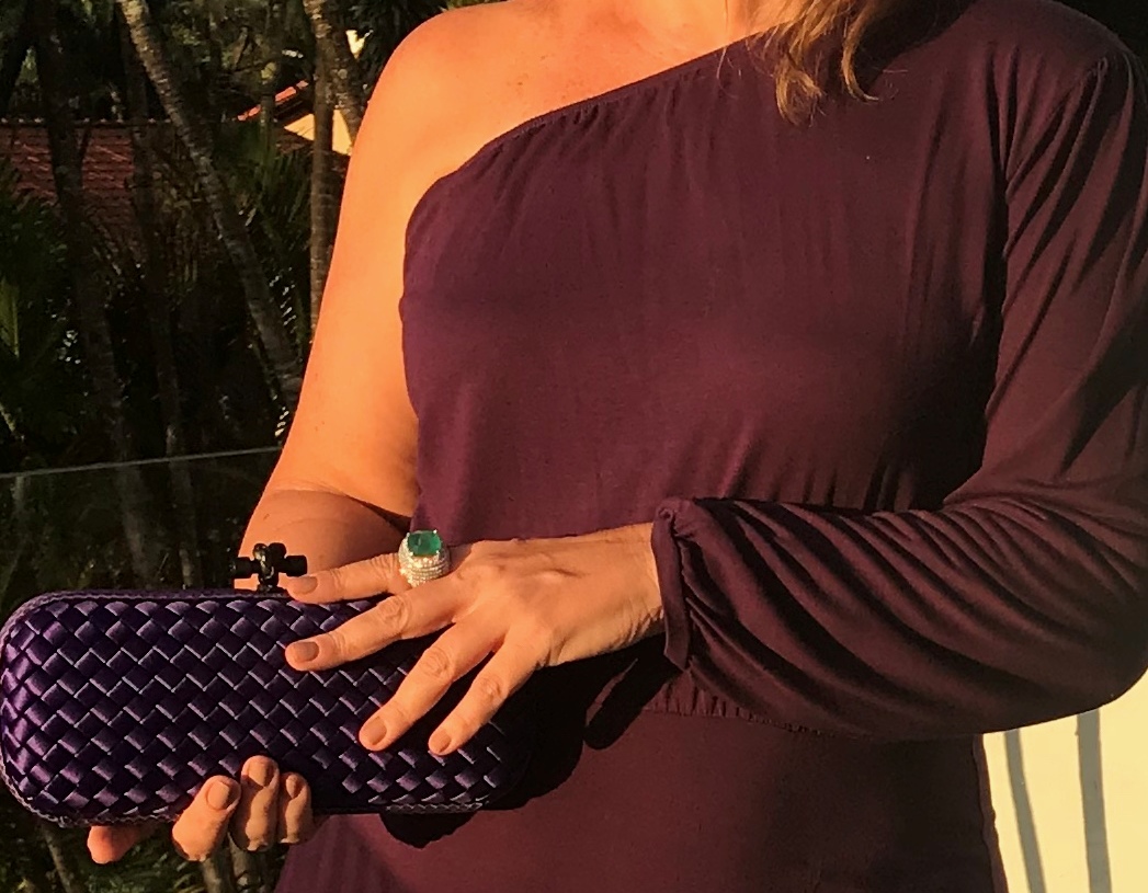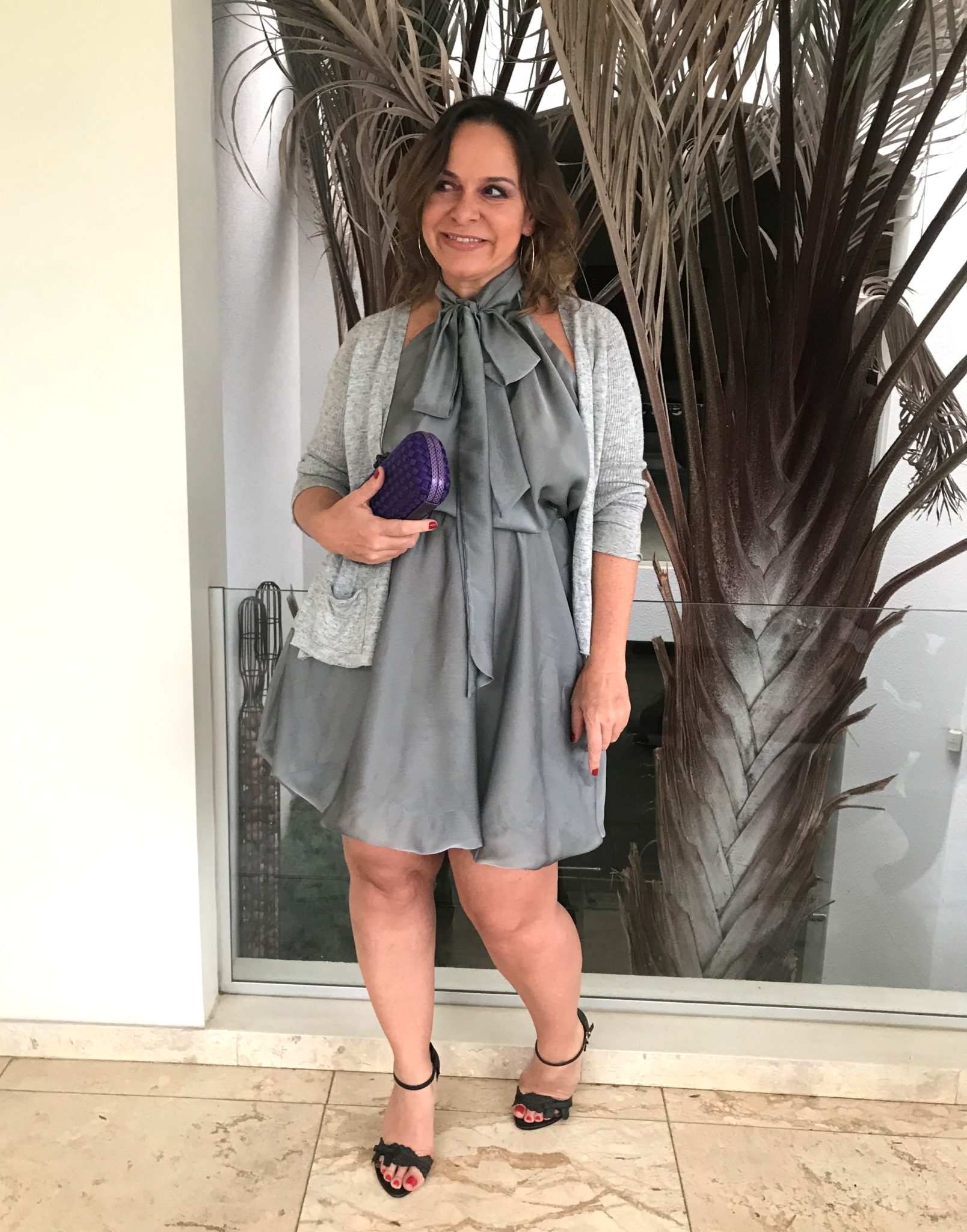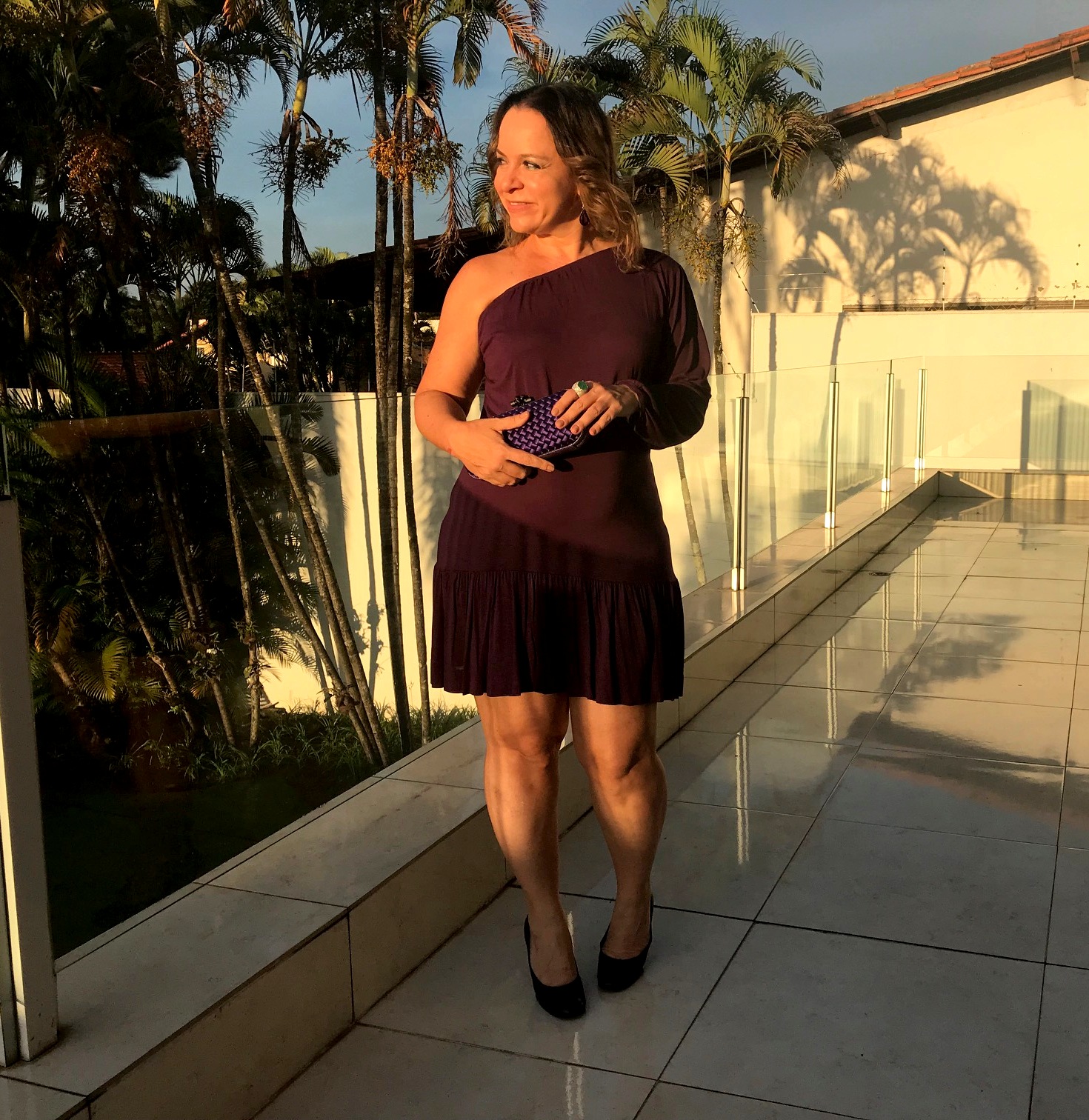 Dessa vez, fiz o contrário: tudo roxo! Vestido, sapato, bolsa e brinco.