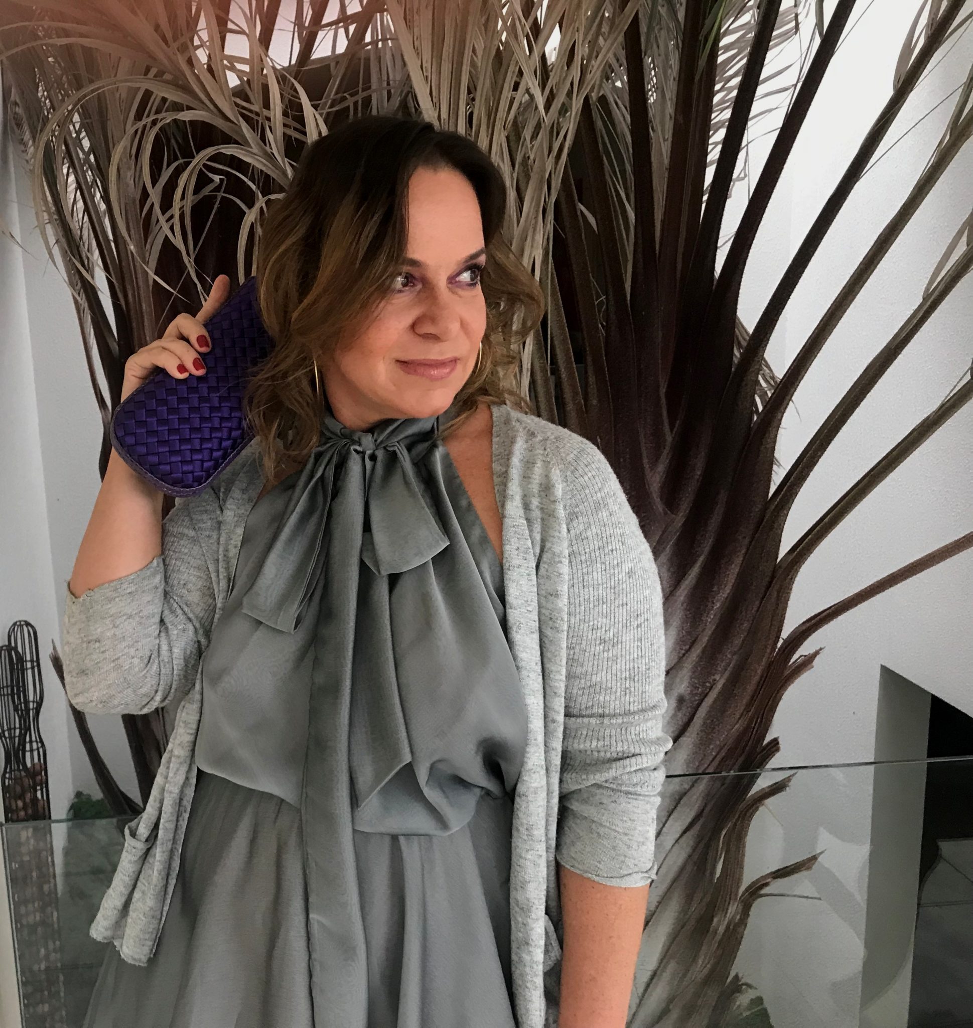 Eu trouxe essa bolsa BOTTEGA VENETA de NY exatamente nessa cor e eu estava louca para usar. Elegi um look em tons de cinza para que eu pudesse ousar no roxo da bolsa e na make. Veja minha inspiração abaixo: