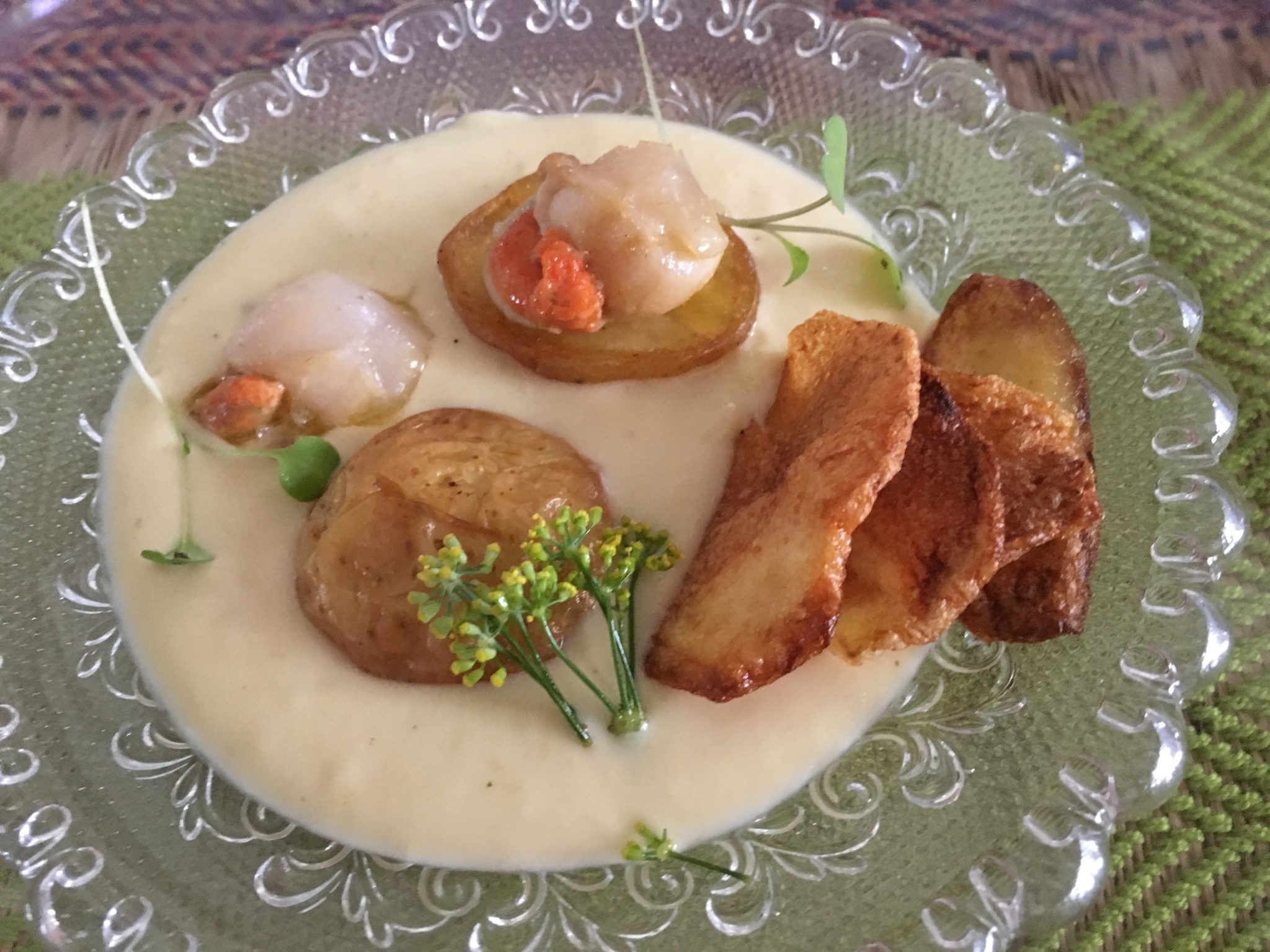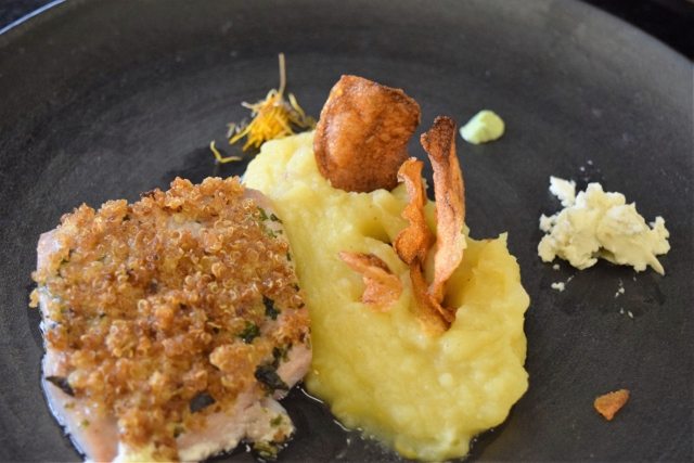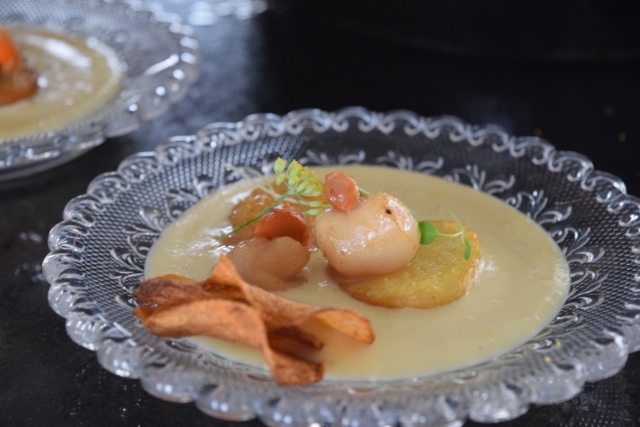 De entrada pedi vieiras sobre batatas coradas, sobre creme de milho e batatas chips e posteriormente o peixe com crosta de quinoa, purê de batata doce e aioli de banana .