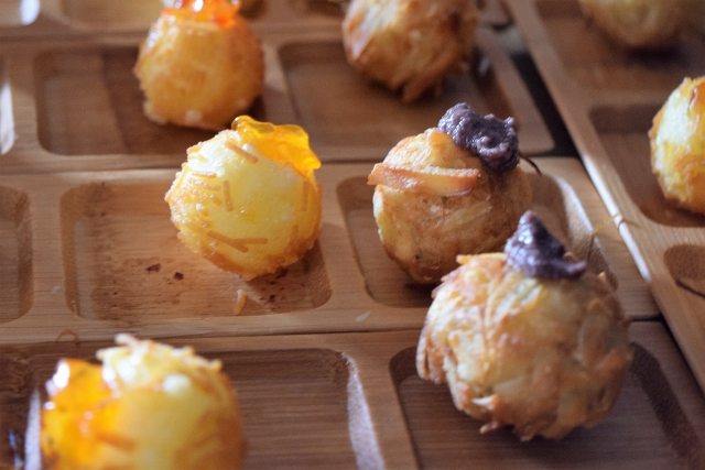 Ela serviu PATACONES , assim como esses apetizers em formas de bolotas em alusão a Botero.