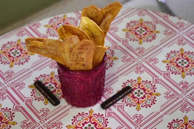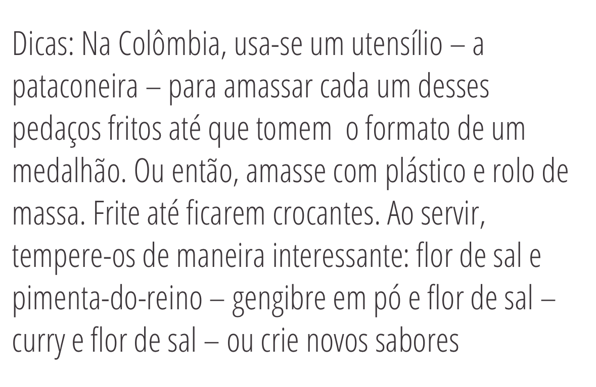 Dessa forma, ela serviu os PATACONES que são chips de banana-da-terra verdes amassadas, fritas e temperadas, muito populares na Colômbia, vendidos lá em qualquer esquina.