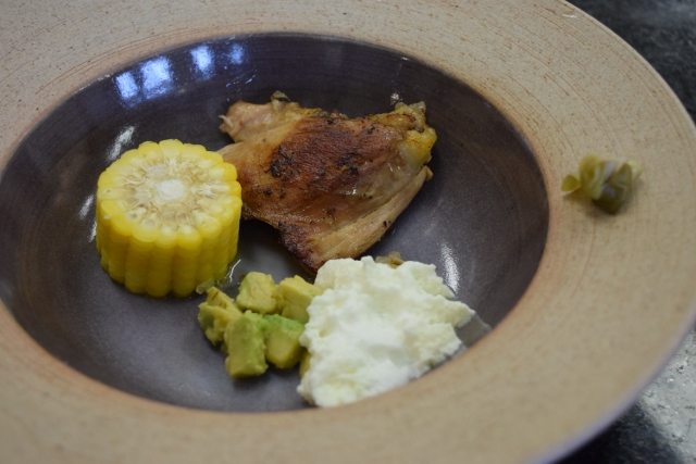 frango confitado, alcaparra, batata, alcaparra,milho, sour cream e caldo de frango e batata