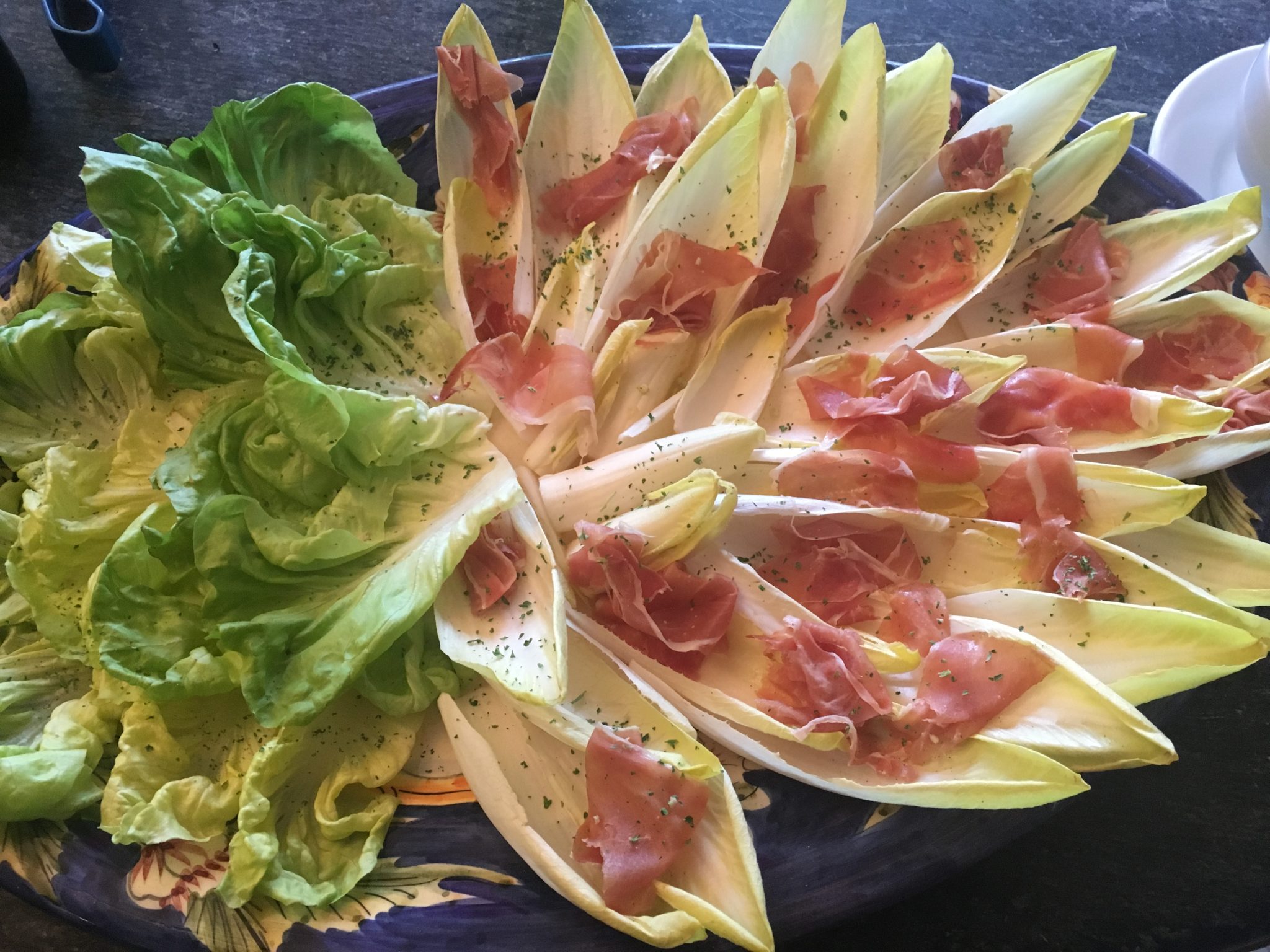 De entrada, uma salada incrível e facílima. A estrela é o molho de mostarda que eu pedi para o Michel e coloquei aqui para vocês. Ele coloca endívia. Fica uma delícia!