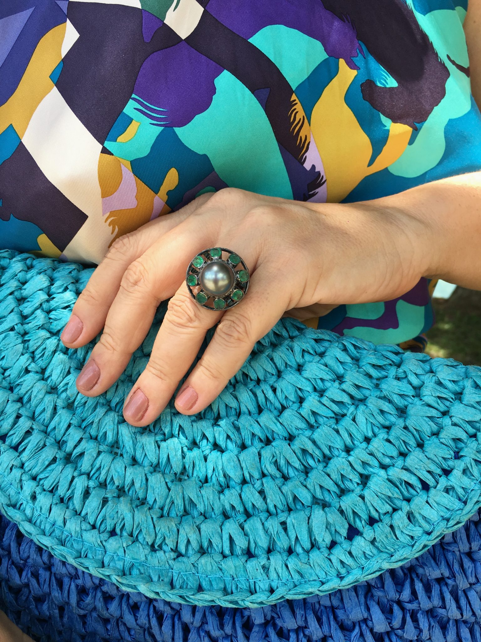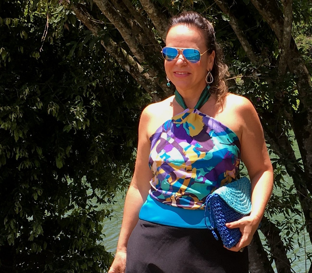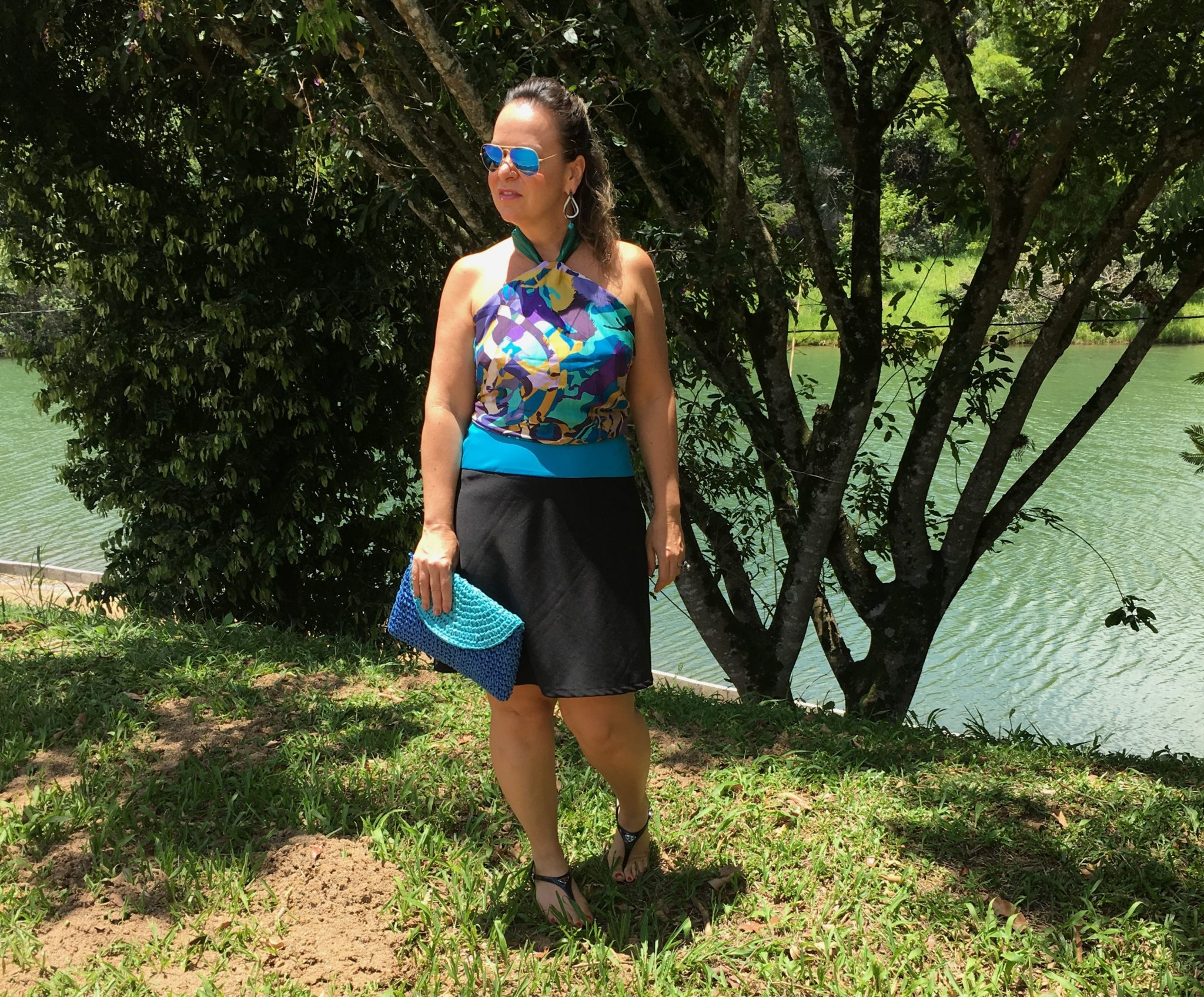 Agora, foi a vez dos óculos azuis com lenço HERMÈS amarrado como blusa- saia acervo – flats PRADA – bolsa LE LIS BLANC em palha colorida, outro ítem a cara do nosso verão brasileiro. Escolhi usar jóias em ouro brnco e esmeraldas, com o detalhe em turquesa do brinco que pode ser removido, deixando-o bem versátil.