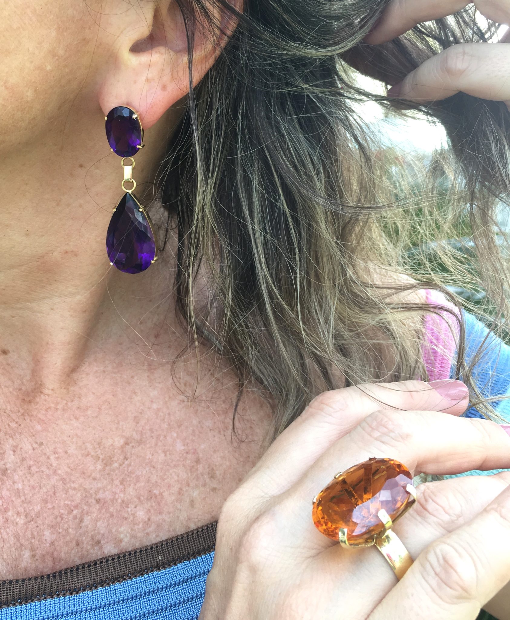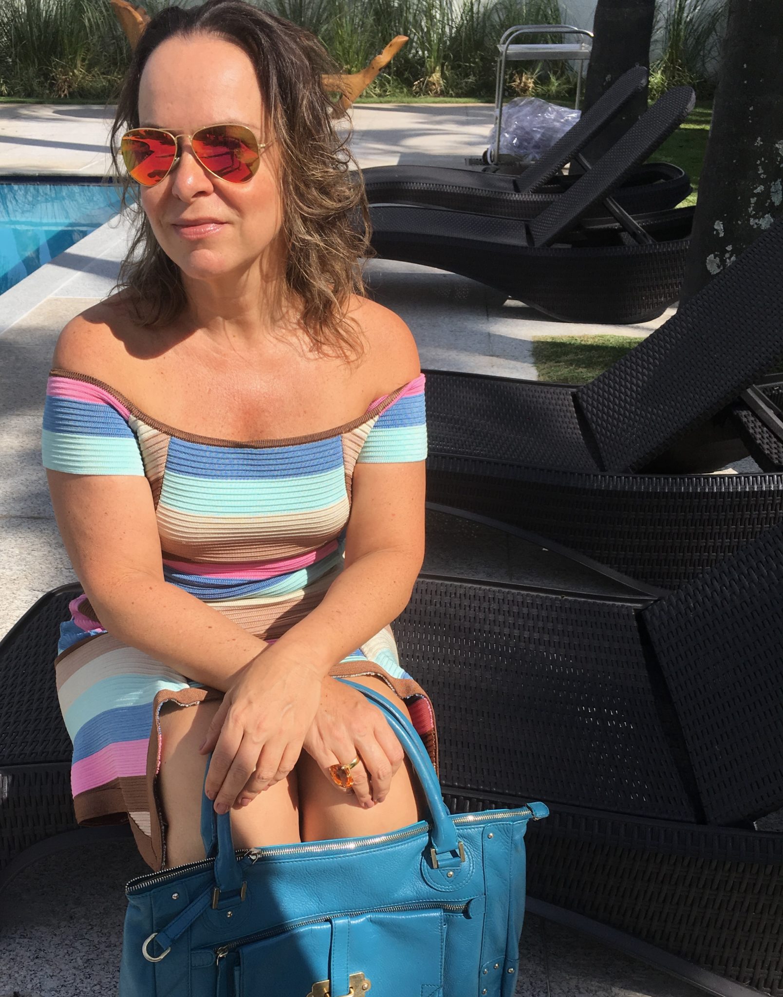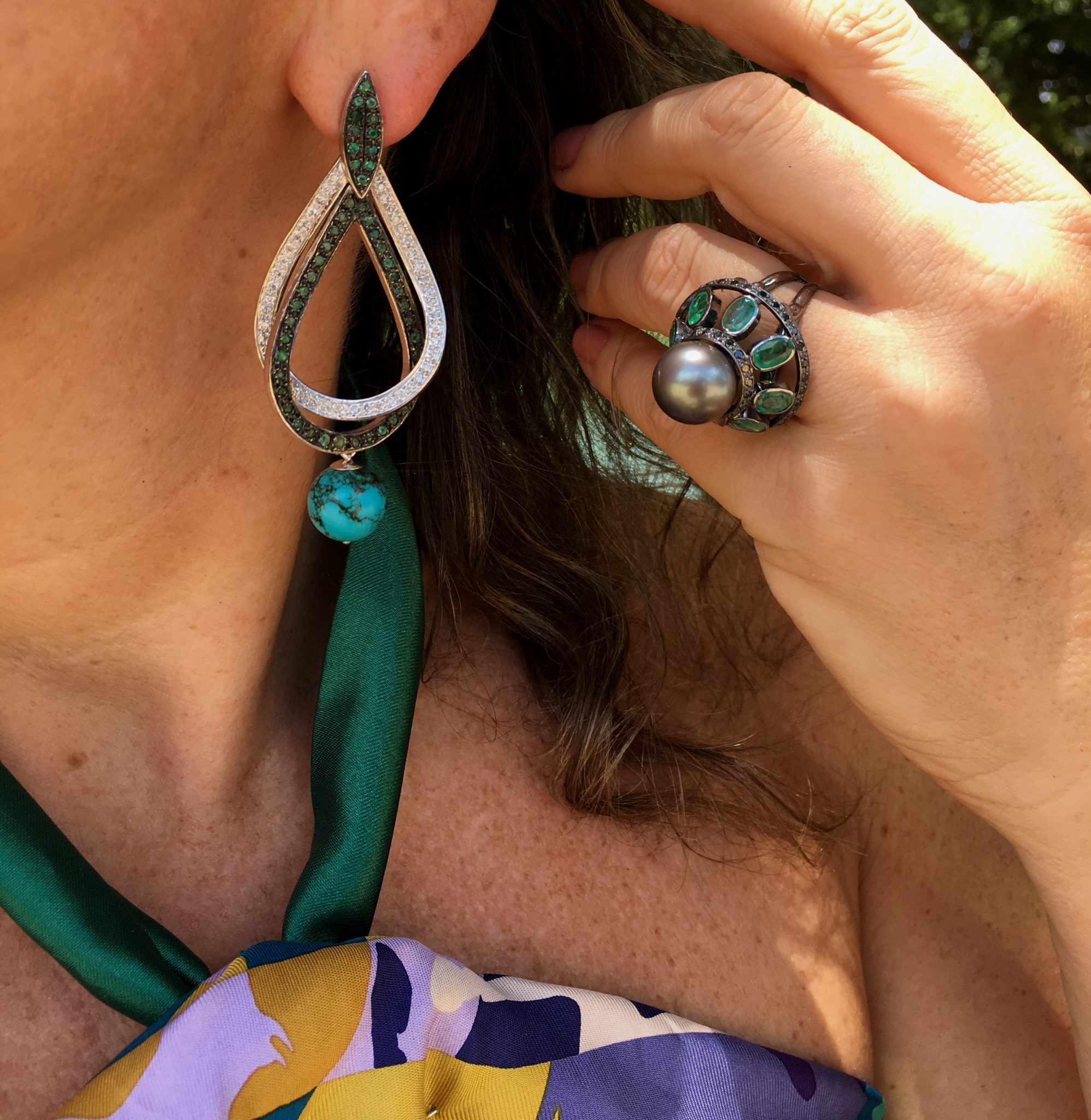 Agora, foi a vez dos óculos azuis com lenço HERMÈS amarrado como blusa- saia acervo – flats PRADA – bolsa LE LIS BLANC em palha colorida, outro ítem a cara do nosso verão brasileiro. Escolhi usar jóias em ouro brnco e esmeraldas, com o detalhe em turquesa do brinco que pode ser removido, deixando-o bem versátil.