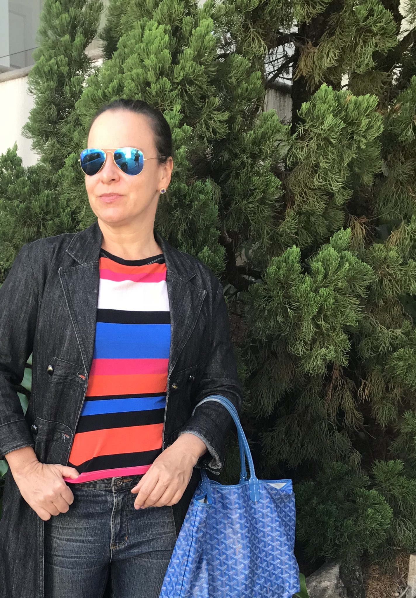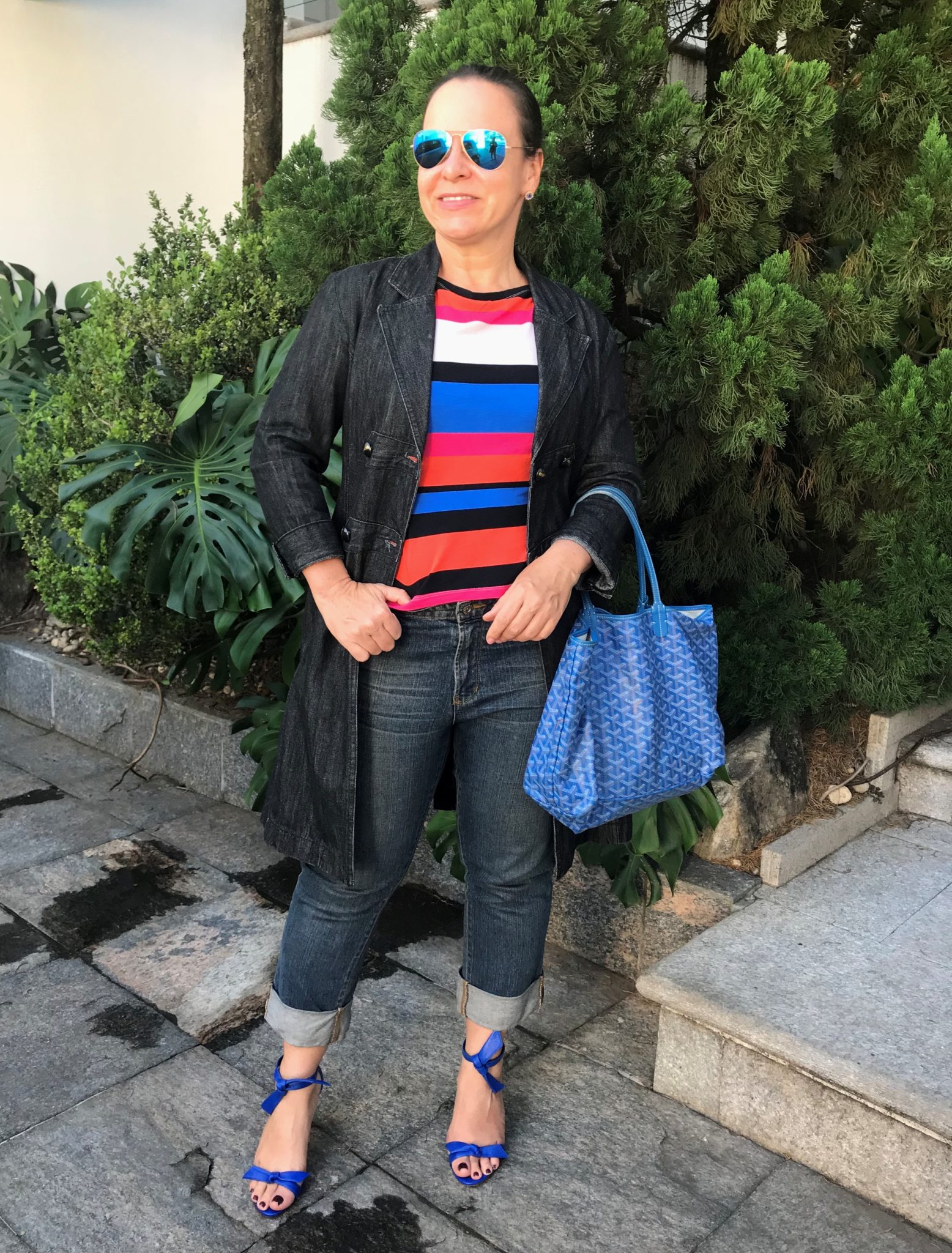 Gostei bastante desse look com um pouco de cor e alegria! Certamente que não estava tãaaao frio, pois o trench jeans não ajudaria muito nesse caso. O azul da bolsa e da sandália assim como dos óculos foi repetido no brinco de tanzanita.