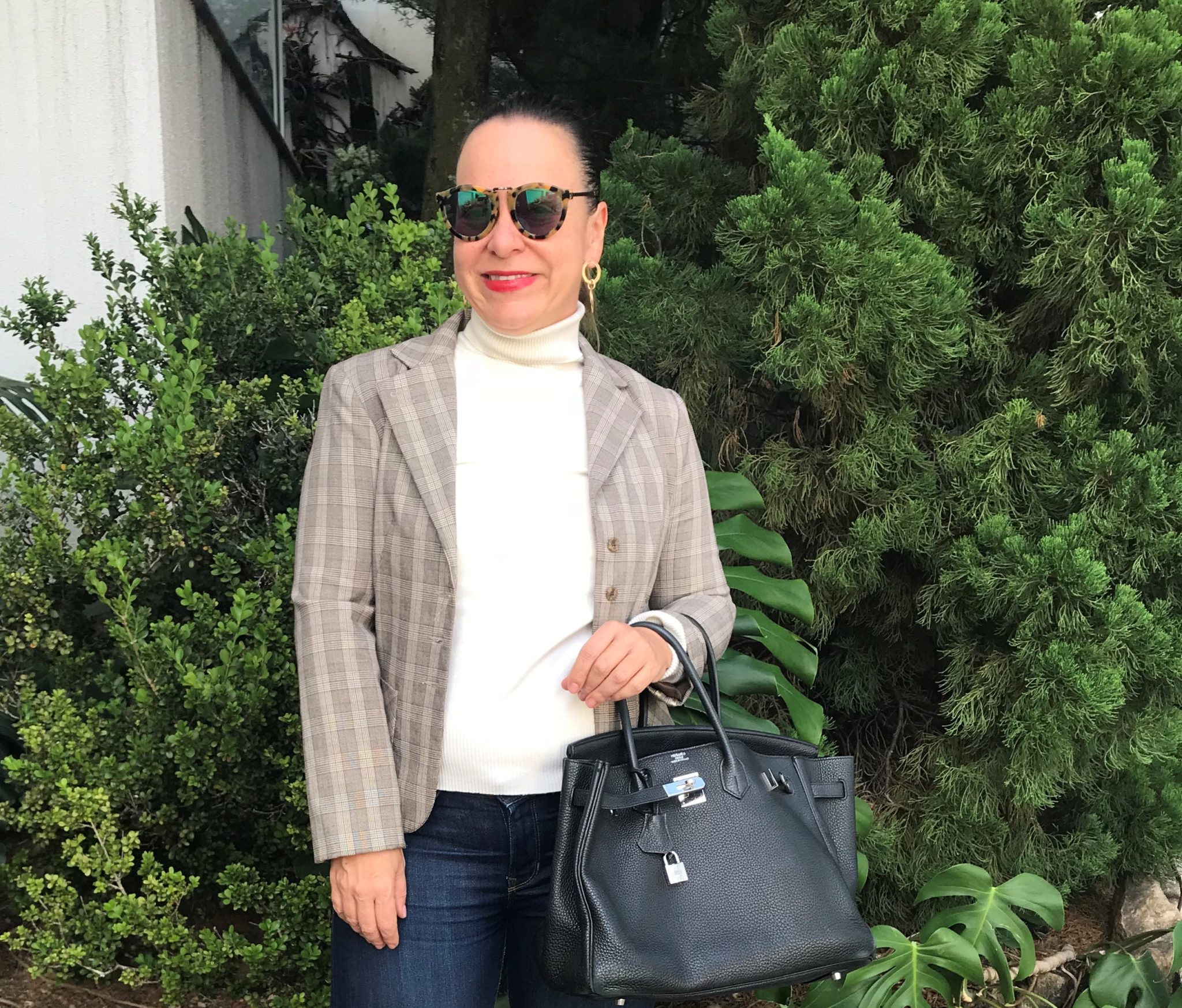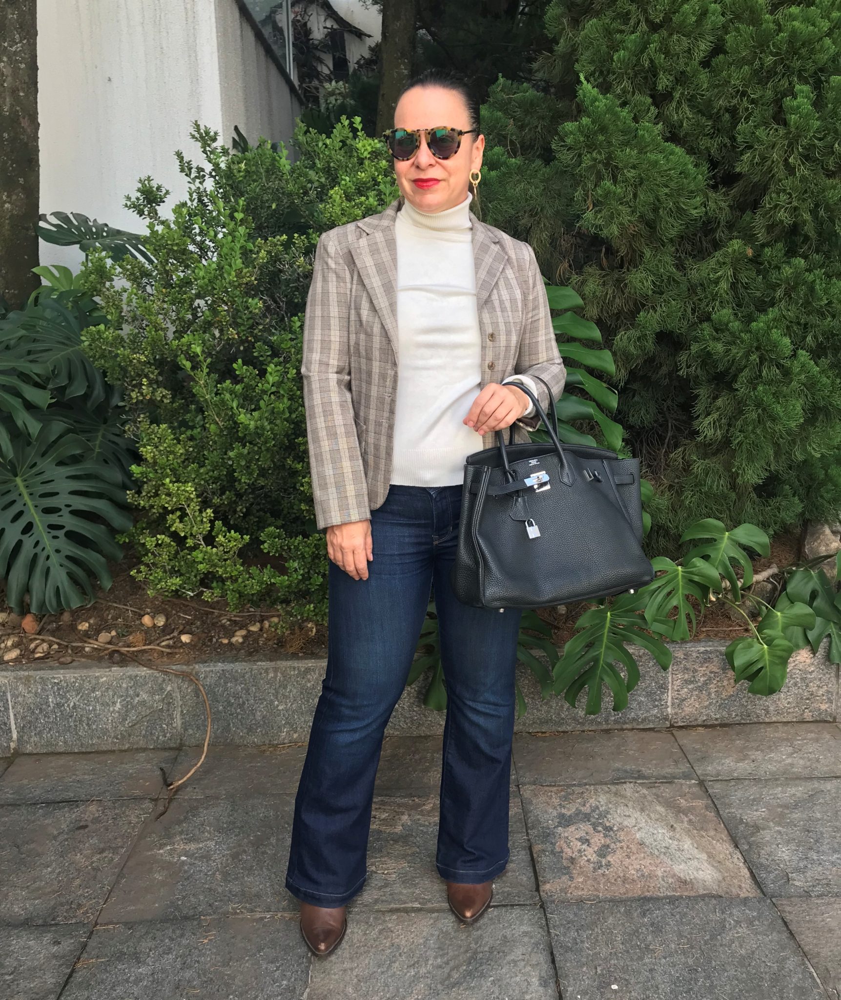 Essa é certamente uma fórmula clássica e sem erro: jeans reto, gola rolê e blaser xadrez. Optei por acessórios clássicos também: bolsa preta e bota marrom. Além disso, resolvi mais uma vez usar uma joia só: apenas um brinco leve e geométrico em ouro amarelo.