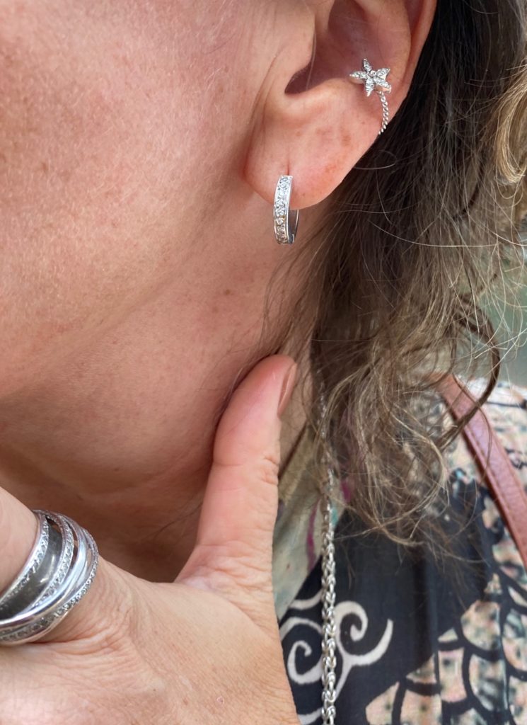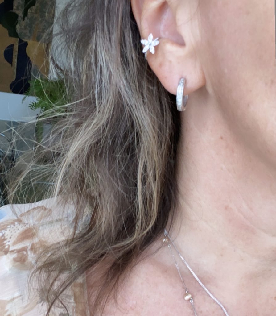 O piercing tem a graça e a delicadeza da flor em brilhantes. Fica lindo se usado com peças delicadas e traz uma certa jovialidade ao conjunto.