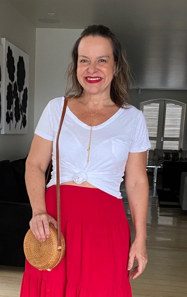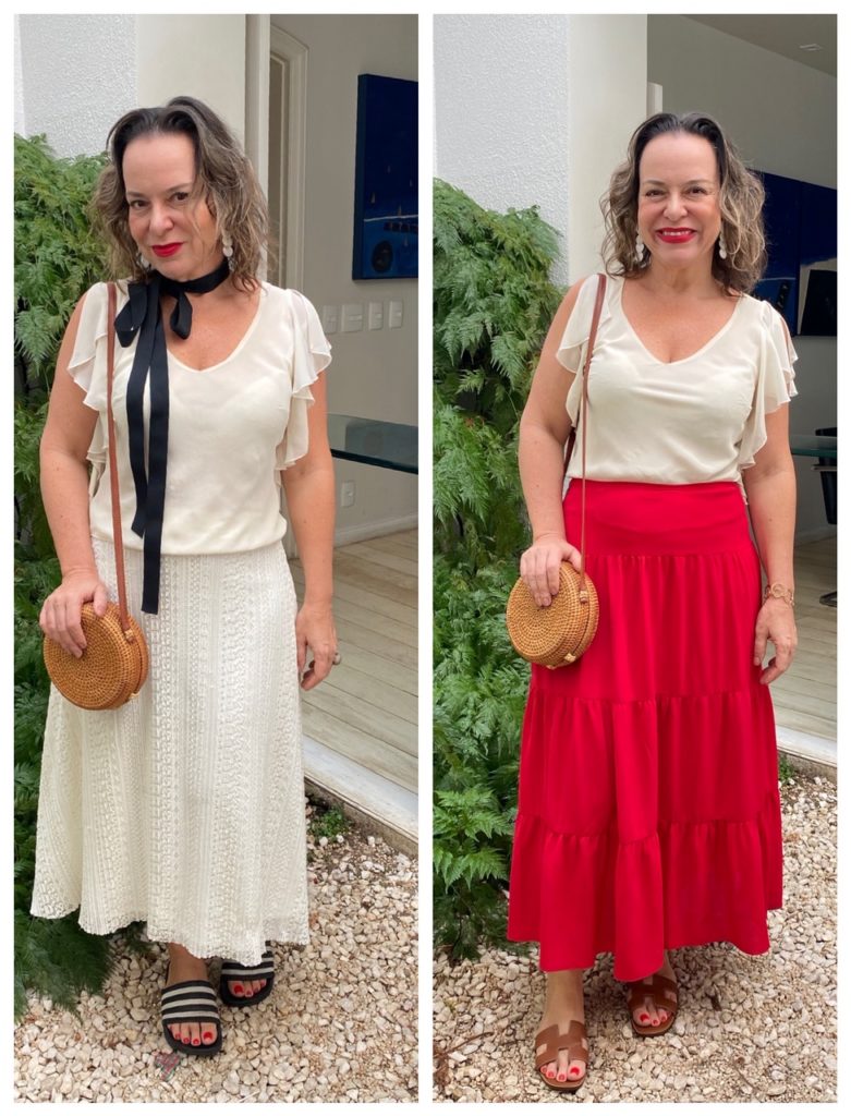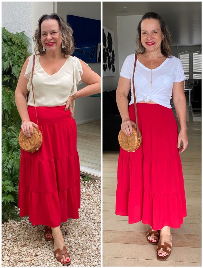 Agora foi a vez de repetir a mesma blusa de seda bege, mas com uma saia vermelha.
