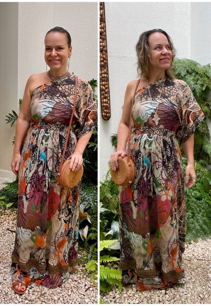 Esse vestido seria usado 2 vezes . Na 1a. de cabelo preso, um fio de cristal e um brinco de franjas, fazendo uma proposta mais chique .