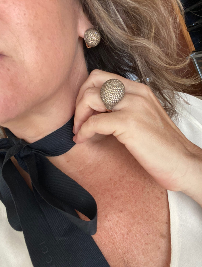 As joias de brilhantes brown foram usadas em um look nude bem leve, quebrado com o polêmico chinelão ADIDAS , para desespero de muitas. Rsrs