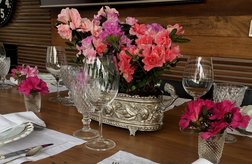 A minha casa acordou assim na 6a. feira – 22/9 – início da Primavera. Com essa profusão de azaléias gritando por aqui, aproveitei essa oportunidade para fazer uma mesa no tema para receber alguns amigos.