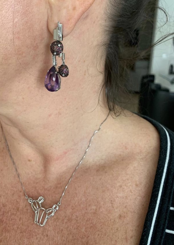 Outra ousadia é misturar joias sem preconceito, desde que tenham alguma unidade entre elas. O colar de prata tem design super interessante e eu resolvi usar com um brinco em rubi, ametistas e brilhantes. Repare que o tom do brinco conversou com o tom do batom, um detalhe bobo que pode fazer toda a diferença!