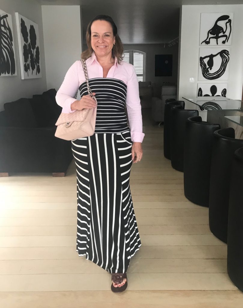 Dessa vez, não apenas a superposição foi a surpresa, como também usar com cor-de-rosa.  Repare bem que todas essas peças listradas são peças fáceis de usar com aquela outra preta ou branca, mas a ideia aqui é mostrar algumas possibilidades diferentes.