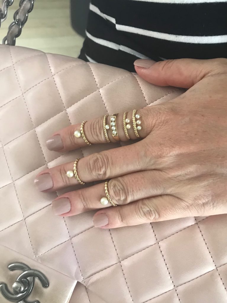 Joias delicadas em pérolas acompanharam a singeleza do rosa bebê não só da camisa, como também da bolsa.