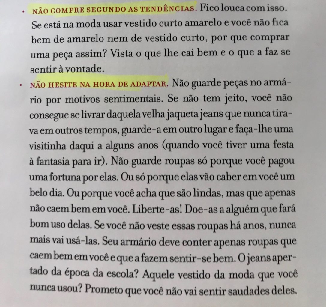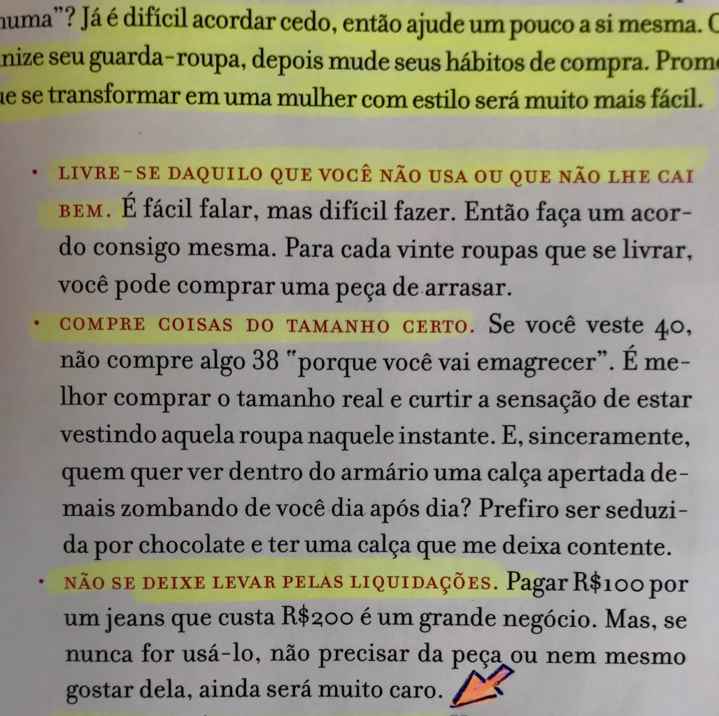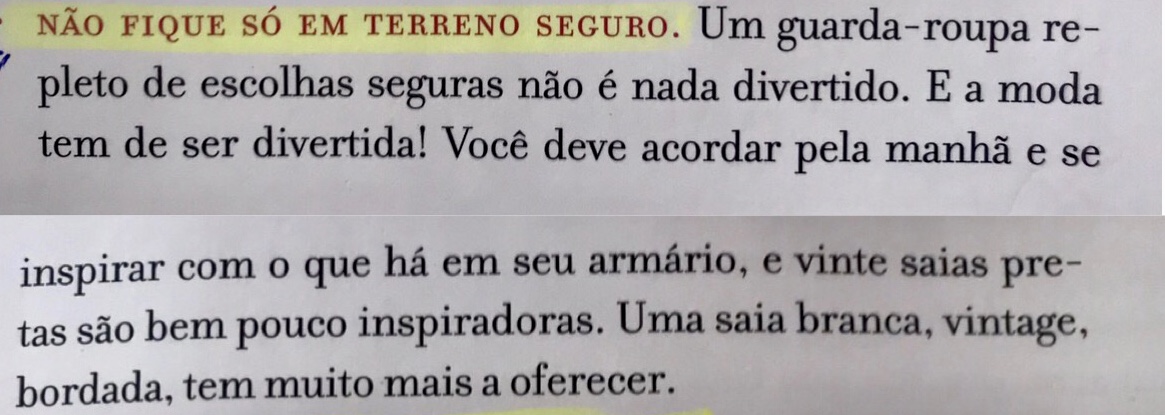 Eu sempre gosto de dividir trechos do LIVRO NEGRO DO ESTILO aqui com vocês. Acho que a autora Nina Garcia escreve de modo divertido sobre a moda, tratando de temas que a gente mesmo sempre fala sobre. Essa frase mesmo, logo aí acima, diz muito. Quanto mais se sabe, de menos se precisa. Quem organiza bem seu guarda-roupas, compra menos e usa muito mais suas próprias coisas.