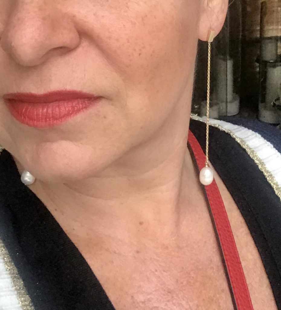 Se a ideia era desconstruir um pouco o estilo esportivo e masculino da jaqueta, o brinco já foi alongado, feminino e delicado, exatamente para fazer contraponto.