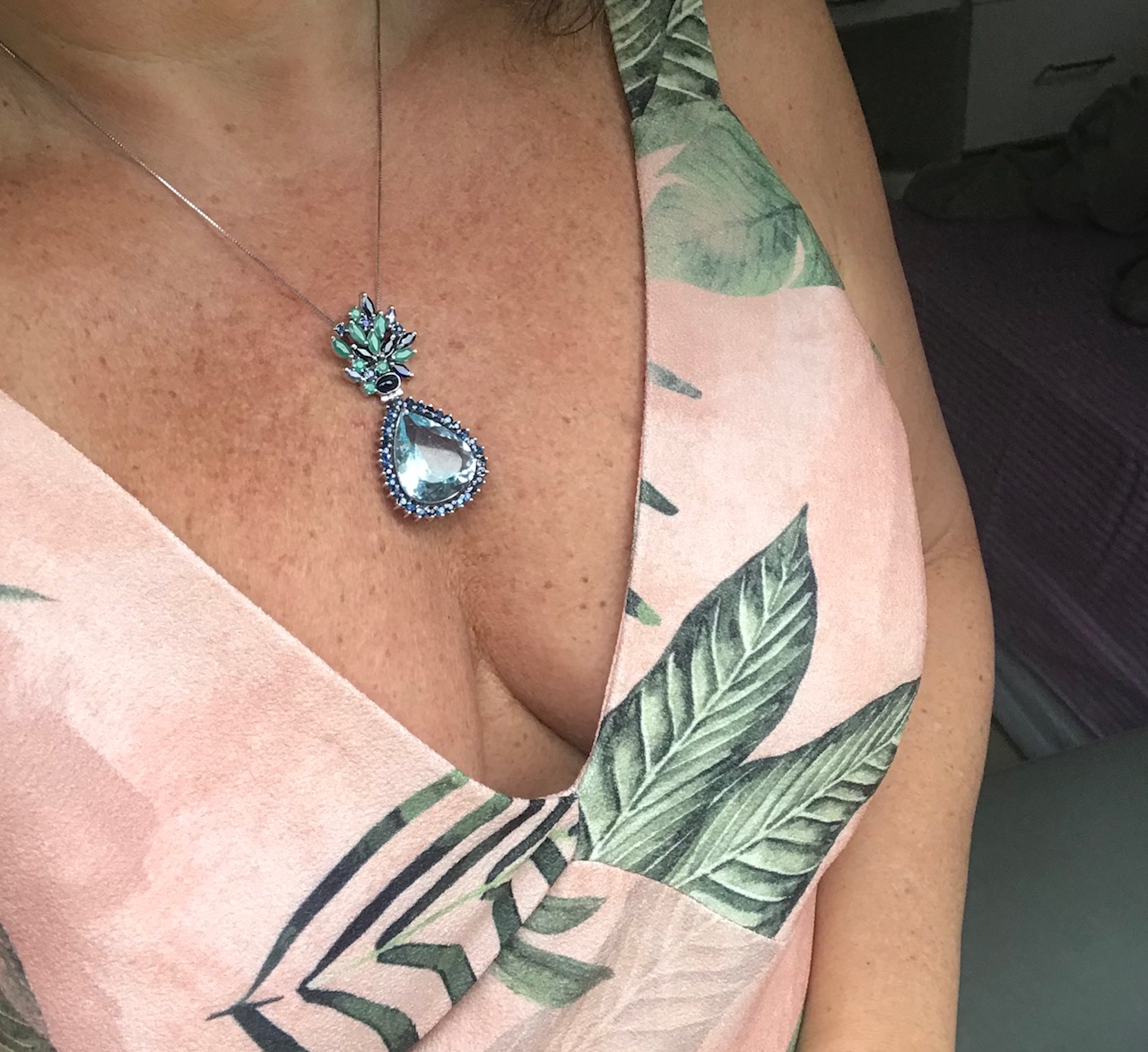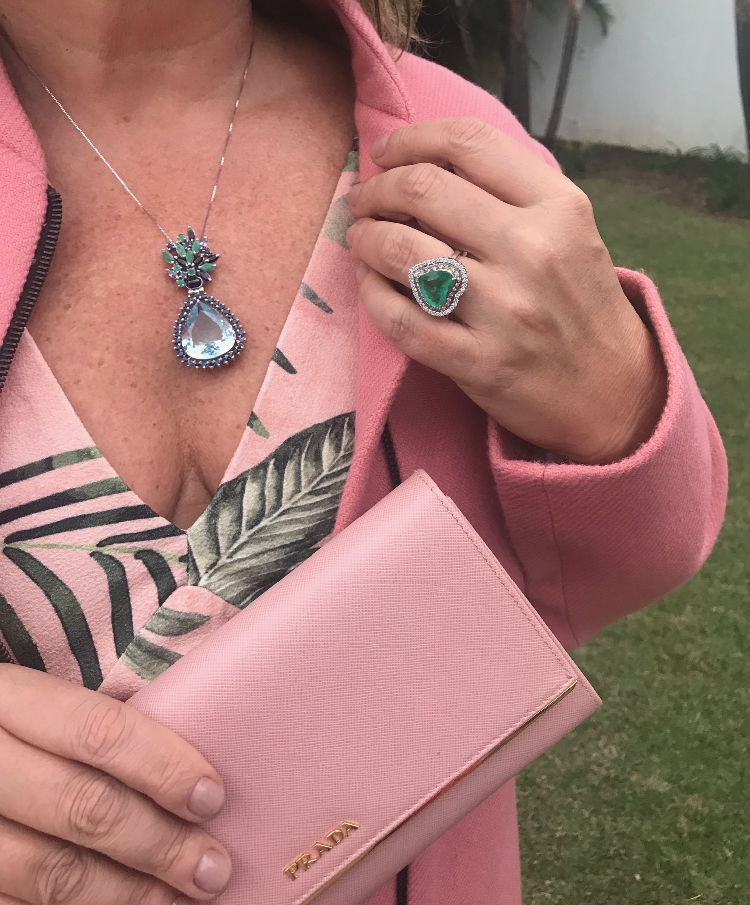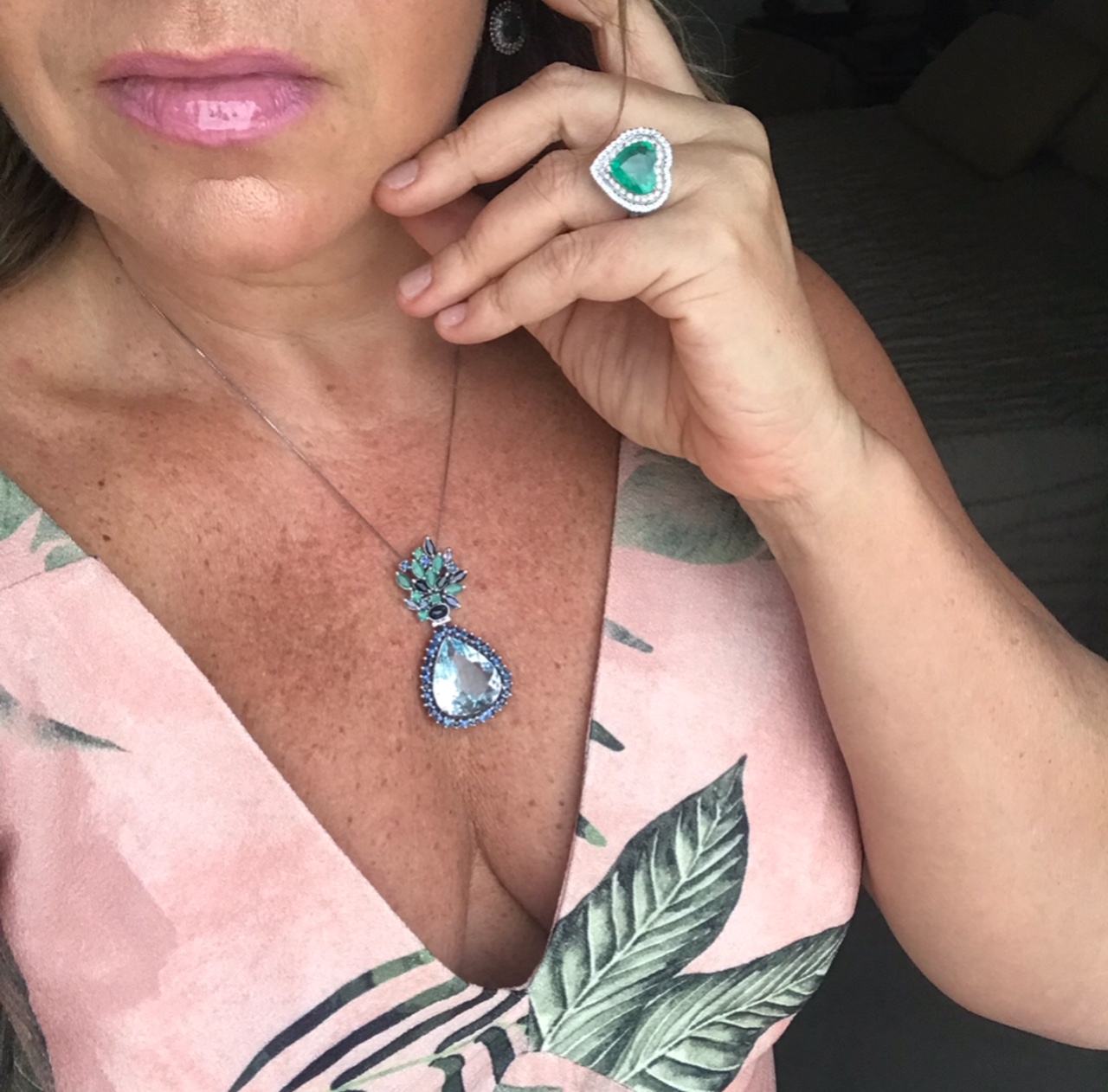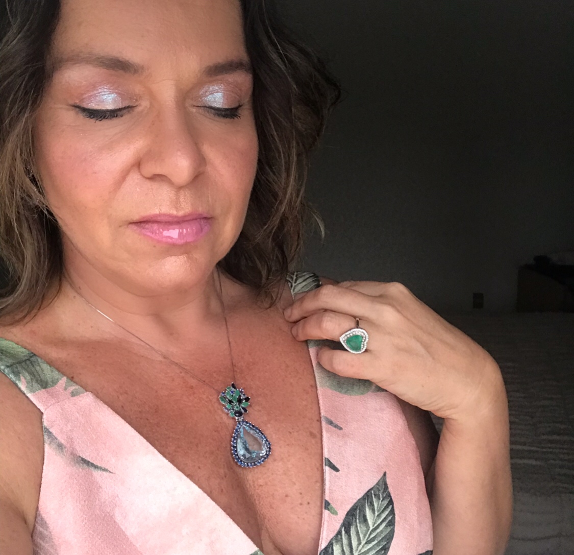 Para essa noite, eu escolhi usar essa estampa linda da SKUNK nesse tom de rosa que eu adoro! Usei joias em tons de verde a azul que remetiam às folhagens do vestido.