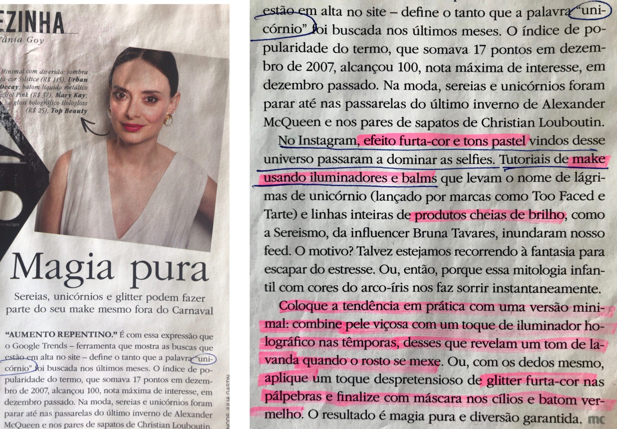 Mas a make eu fiz bem verãozão mesmo! Desde o início desse ano, com o ápice no Carnaval, entrou em alta a MAKE HOLOGRÁFICA , fazendo alusão aos seres mágicos dos sonhos. Unicórnios, sereias e muito glitter são a base dessa historinha que a gente conta através da make. ( MARIE CLAIRE | fevereiro 2018 )