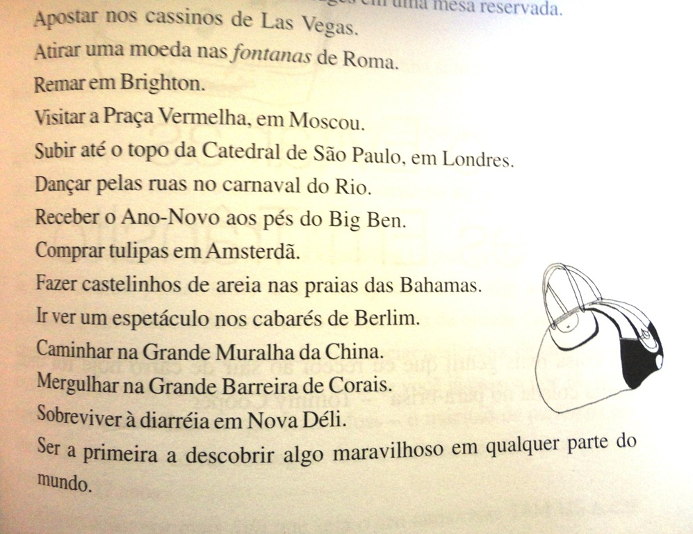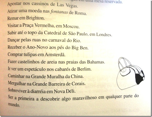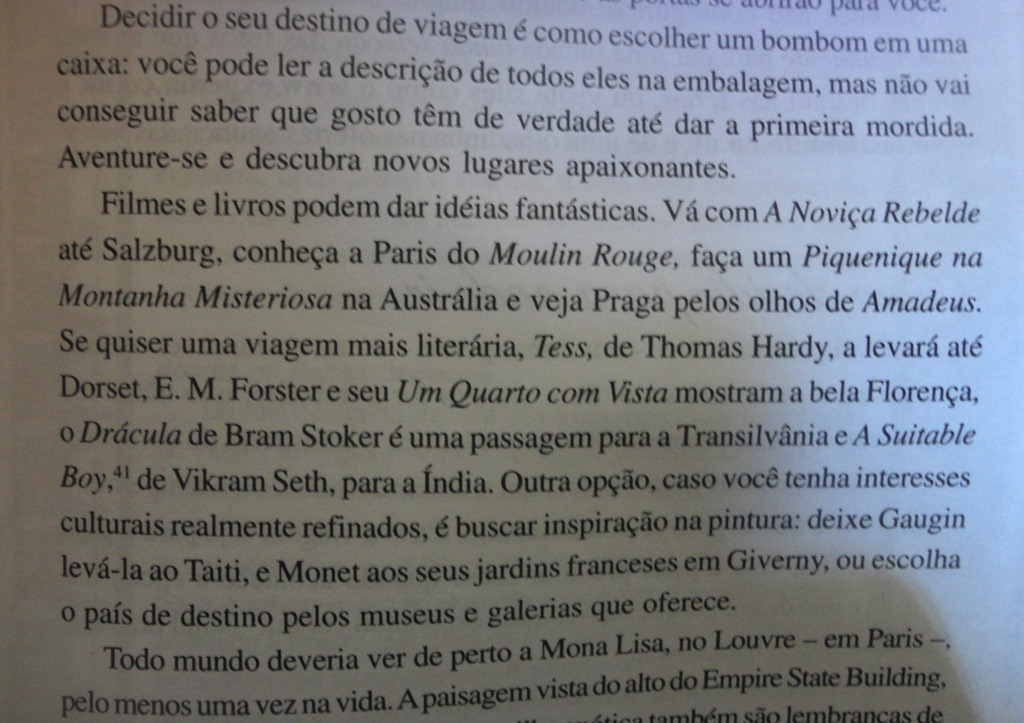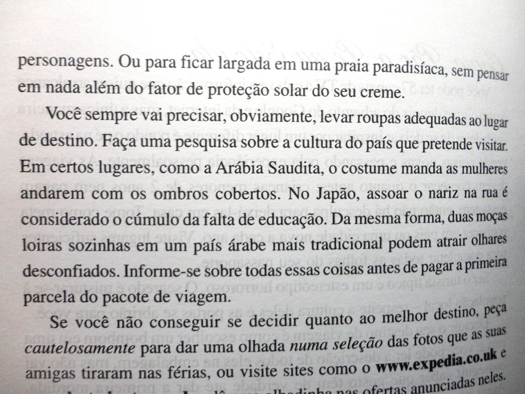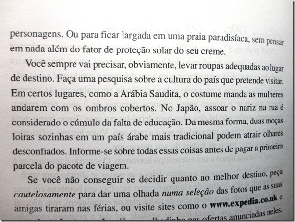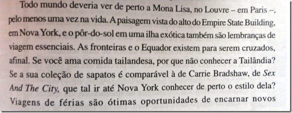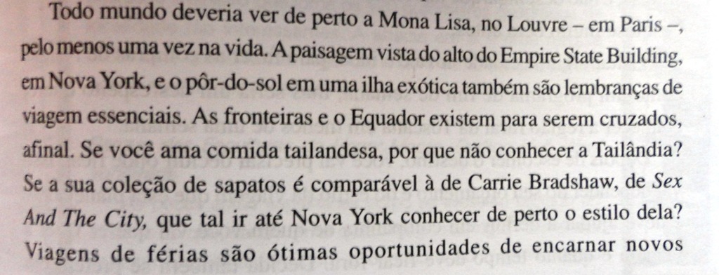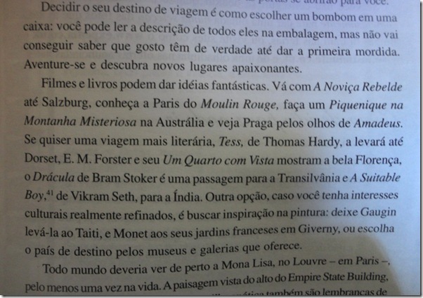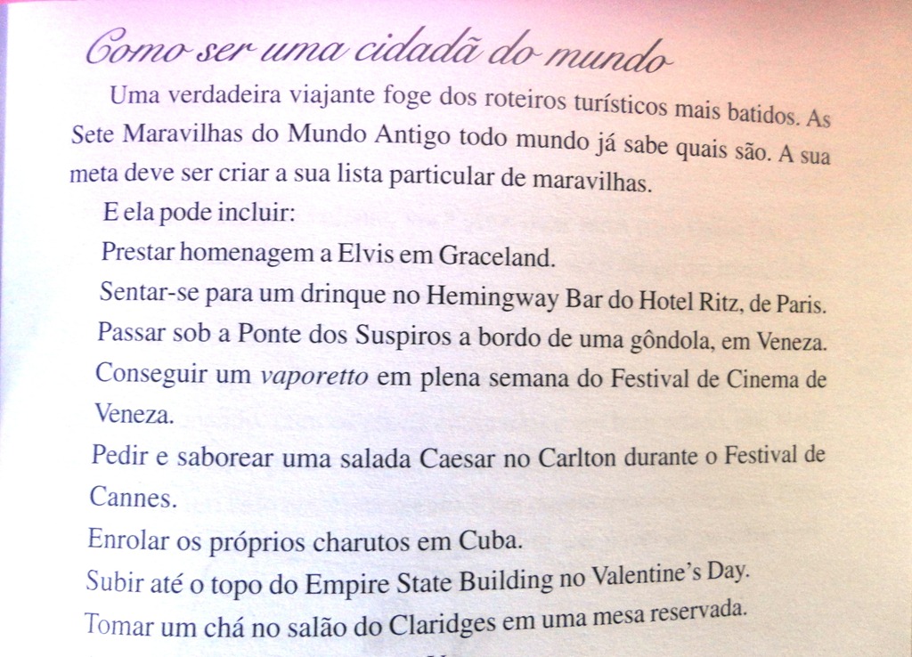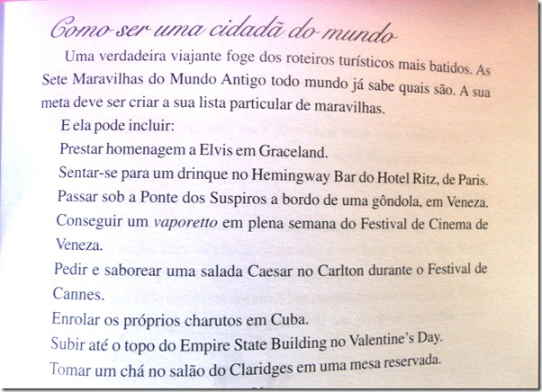Já falei dele aqui, já postei algumas coisas, e salvei outras para postar ( se quiser, faça a busca por palavra chave no site à direita com o nome do livro) . Qdo eu terminei de ler, dei ele ( o meu mesmo) de presente para a Aléxia Carvalho do blog noatelie. Achei a cara dela ! Tenho o hábito de fazer isso : qdo termino livros desse tipo, mando para quem se parece com ele com uma dedicatória do porquê… rsrsrs . Hoje, o tema é viagem ! Oba!