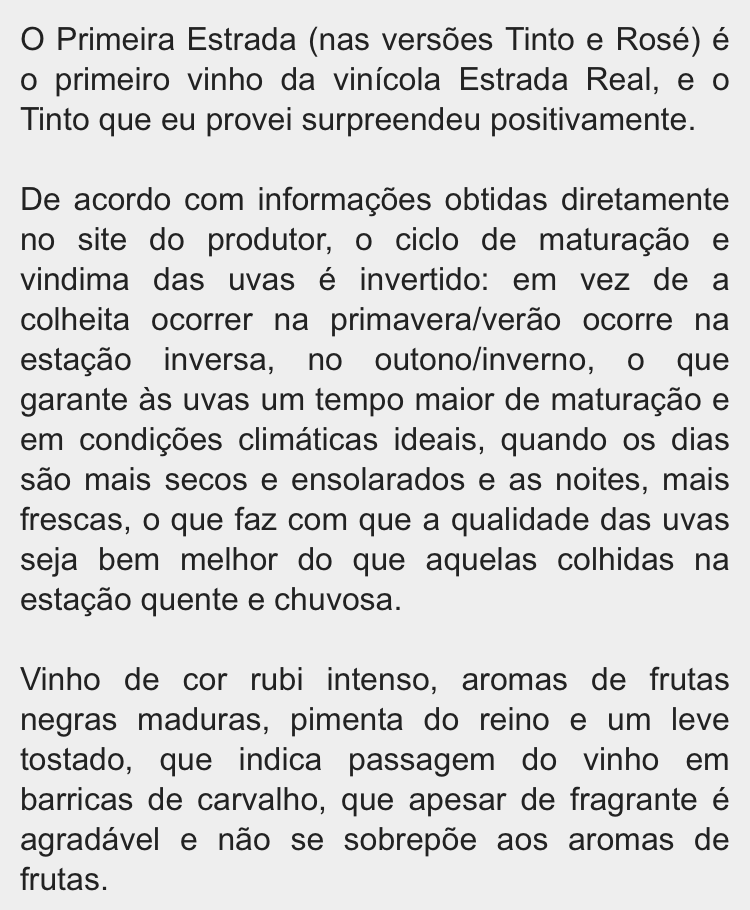 Comprei o PRIMEIRA ESTRADA no sábado passado, busquei informações na internet, e vi que era um vinho próprio para carnes. Pronto: marido fez o jantar e gostou muito do vinho. Indico!