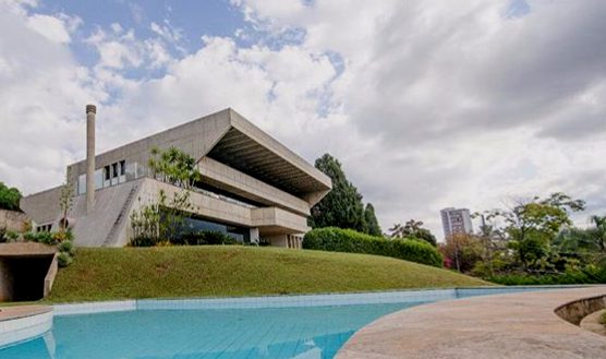 2. Preste atenção na arquitetura modernista/brutalista da casa, construída nos anos 70 toda em concreto armado aparente, com clarabóias para iluminação, escadas imponentes, varandas incríveis, pilares redondos no meio dos vãos, elementos arquitetônicos marcantes quebrados com madeira, cor e design .