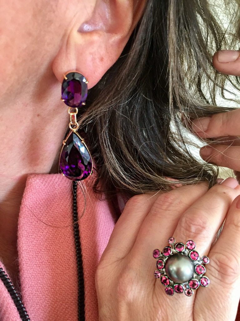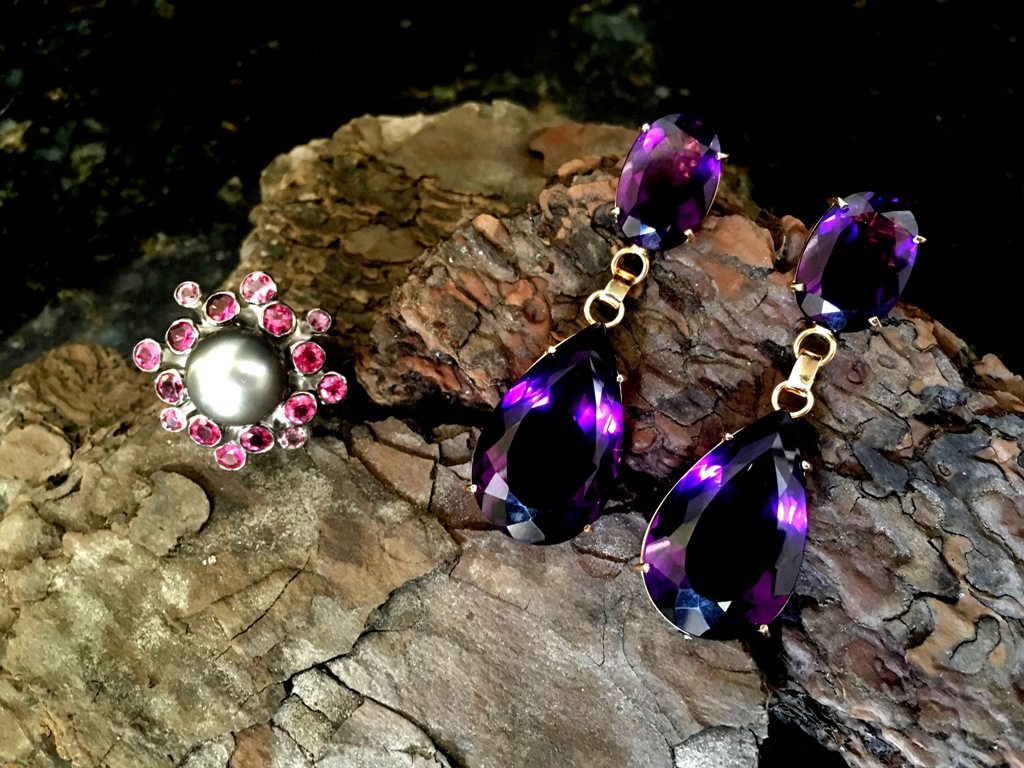 Brinco em Ametista e Anel em pérola South Sea e turmalina rosa