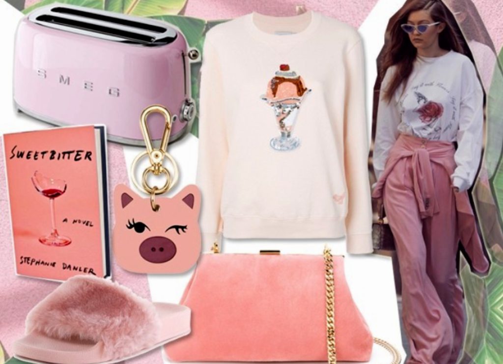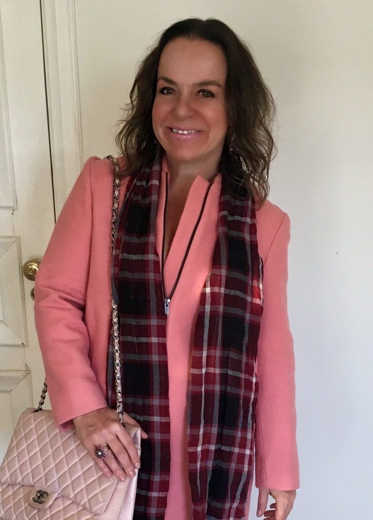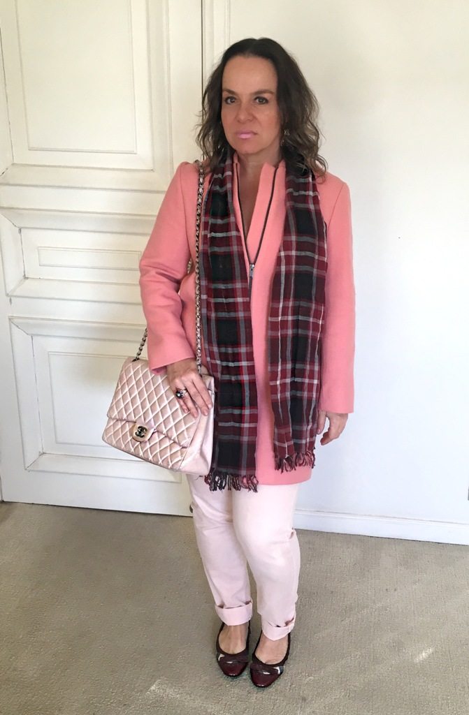 Base do look toda em rosa com toques de xadrez vinho Burberry, no cachecol e na sapatilha.